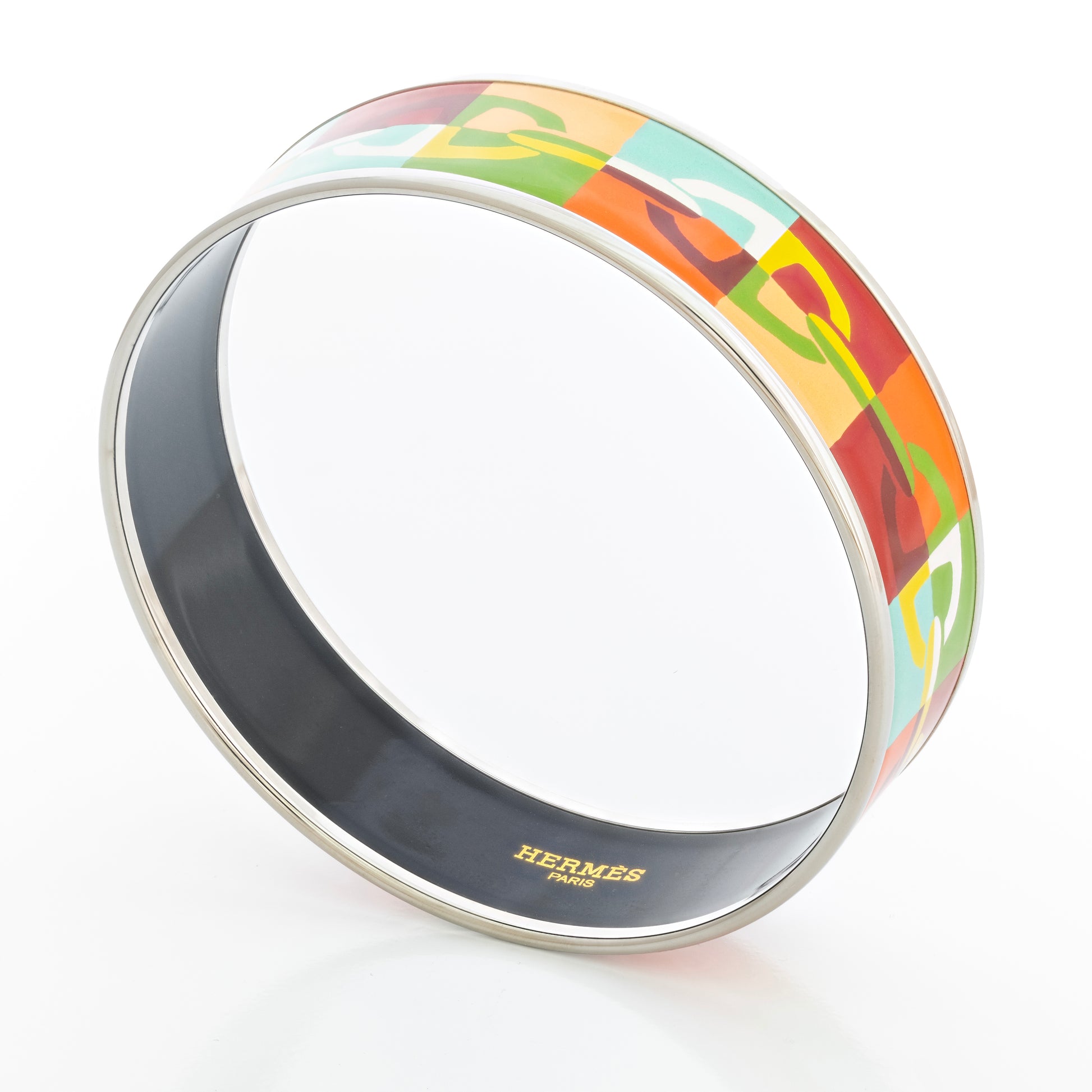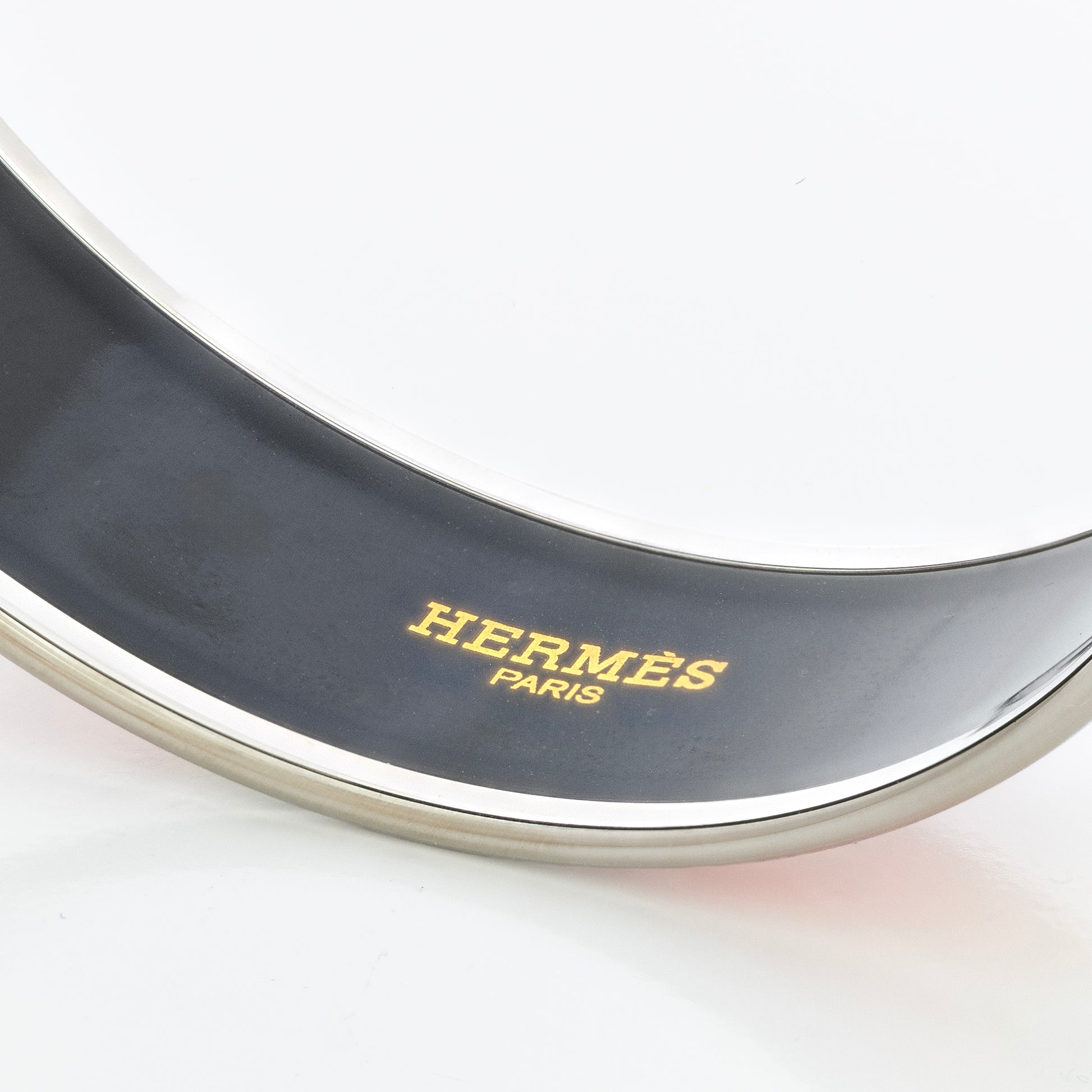 Hermès enamel bangles are kiln-fired vitreous enamel over a rigid metal core. Color layers are applied and fired multiple times, then lapped and polished to a glass-smooth finish. Rims are plated for durability and tone consistency; interior edges are deburred for comfort. Final QC verifies seam alignment, even plating, and flawless glaze.