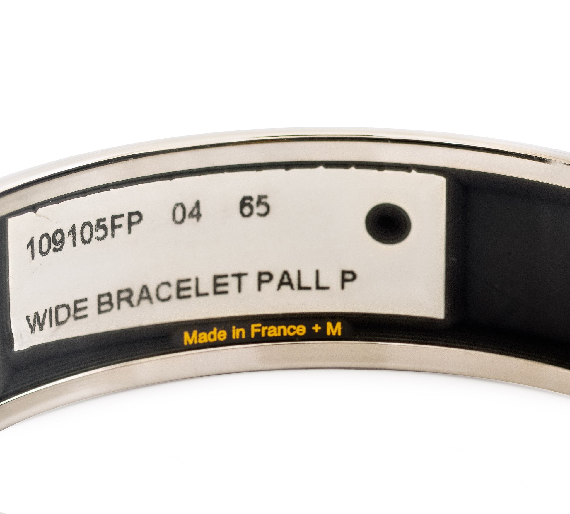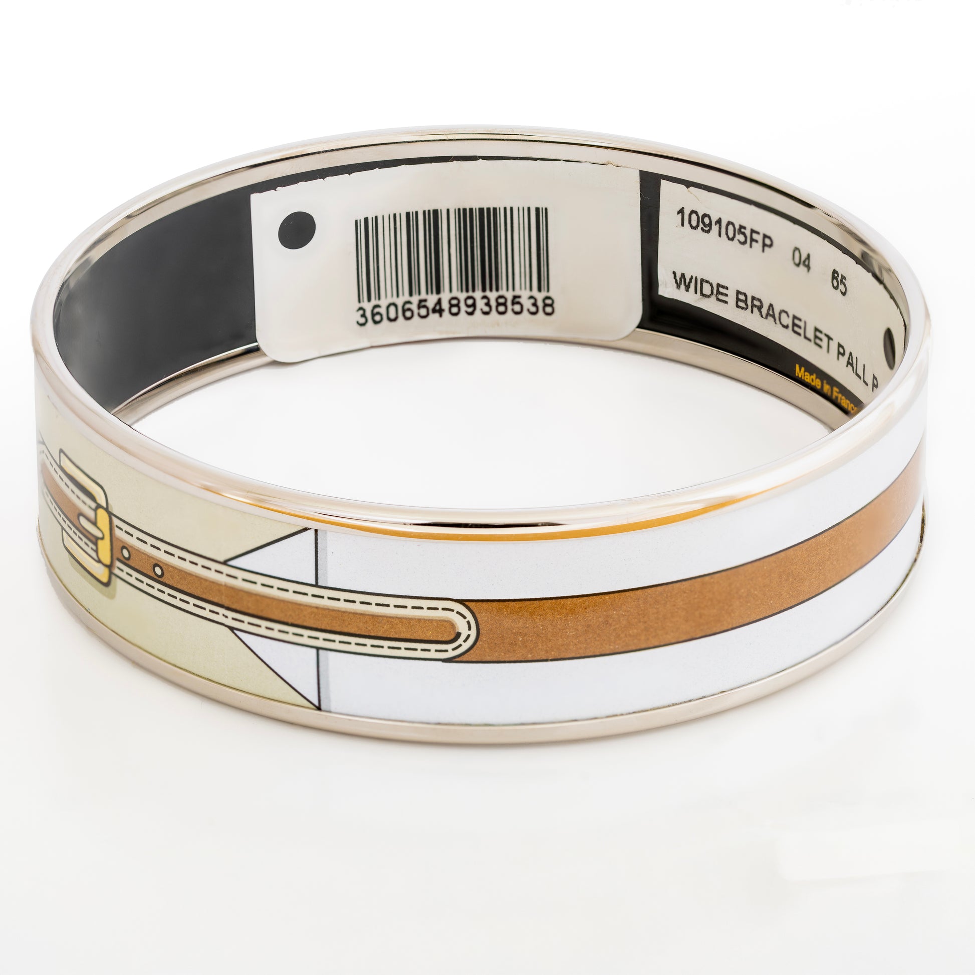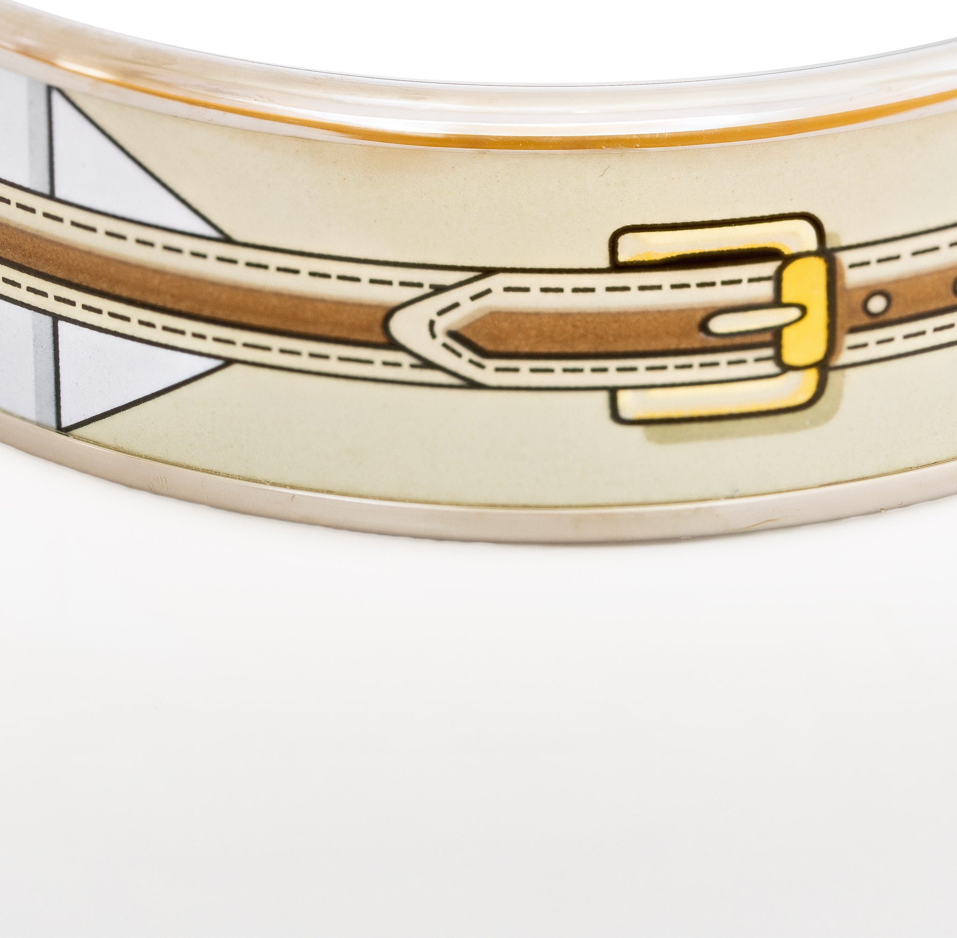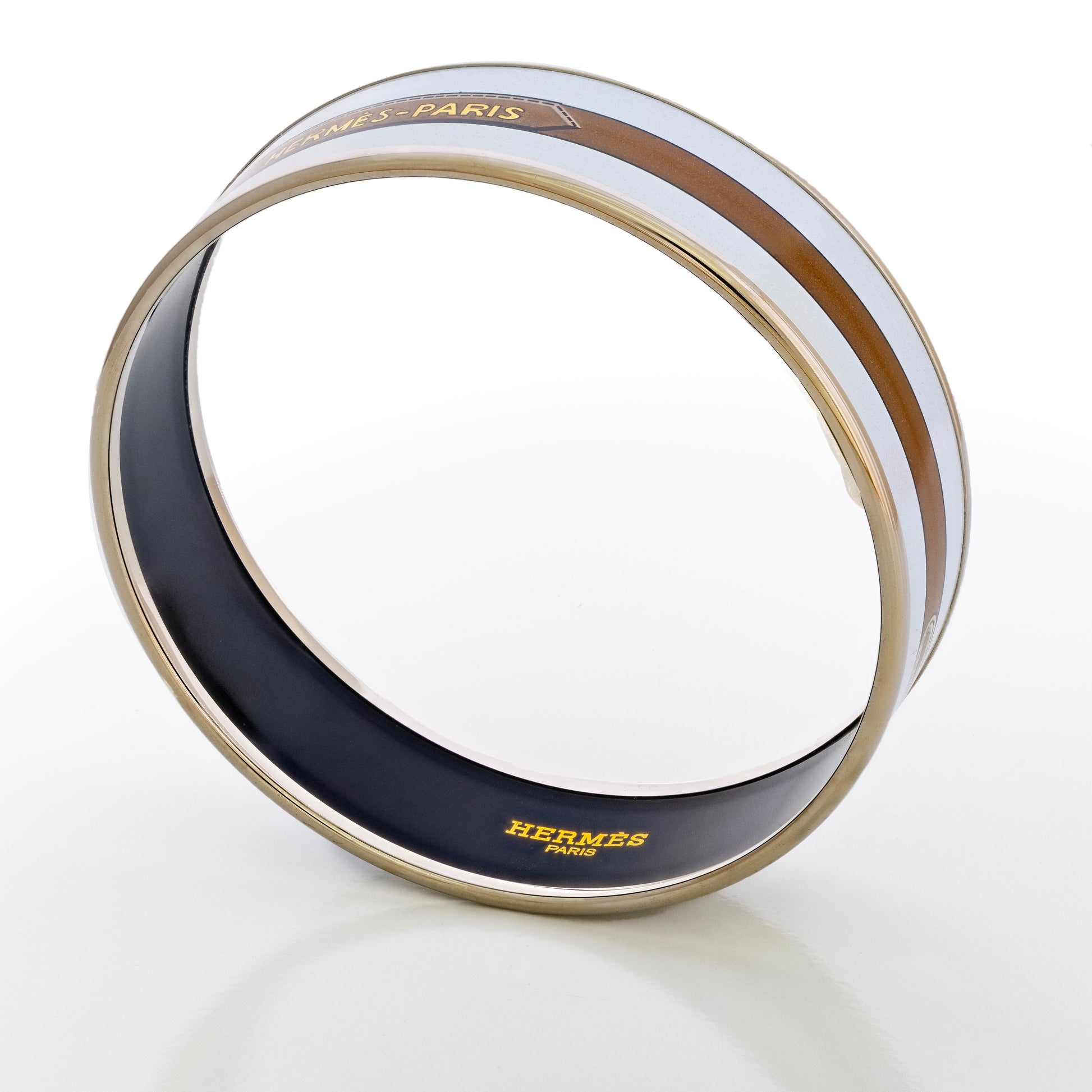 Hermès rigid enamel bangles are made on a precisely formed metal base, finished with a plated rim, then decorated with multiple layers of enamel (glass-based) that are kiln-fired and polished to a high-gloss surface; the final result is a crisp motif, smooth edges, and a durable, jewelry-grade finish when cared for properly.