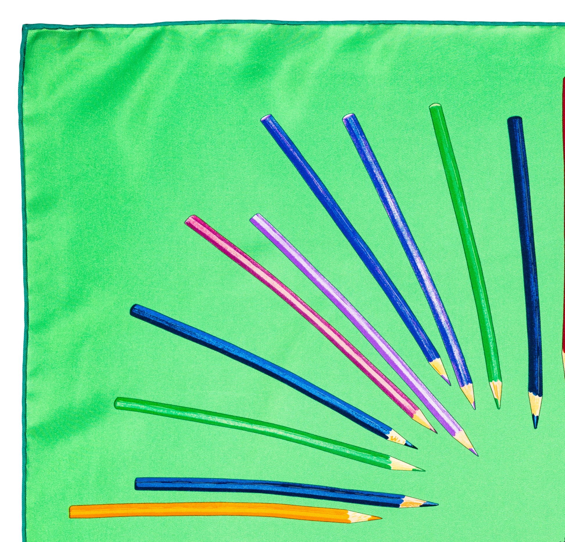 Cooke’s witty composition frames the carré with meticulously rendered coloured pencils arranged by hue, converging toward a central field of life-like pencil shavings. The trompe-l’œil realism and the hand-lettered “À VOS CRAYONS!” evoke the playful moment that sparked the design: the artist’s child brought him a pile of pencils and asked what to do with them—Cooke answered on silk. Issued in several colourways, the green ground highlights the multicolour spectrum while letting the warm cedar-toned shavings pop, a balance Hermès is renowned for in its silk printing.